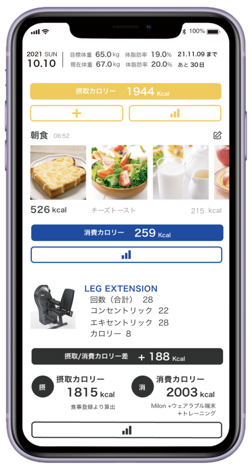 アプリで運動と食事を管理 トータルサポートアプリ MEon HOME 〉サービス 〉MEon MEonとは・・・ Milonのトレーニングを行うと自動的にトレーニングデータ、消費したエネルギー量が保存されます。食事管理については食べたものを入力するだけで、栄養バランスの確認や食事のアドバイスを受けることができます。 こんな人にオススメ 「食事量を把握しながら適切な運動をしたい」「減量したいが必要なエネルギー、栄養素も知りたい」「摂取カロリーと消費カロリーを把握したい」 【参考資料】ヘルスケアプラットフォームアプリ「MEon」 | 株式会社アライアンス (alliance-jp.com) milon IMPRO 有酸素運動マシン 体組成計 音波振動マシン ストレッチスペース MEon 営業時間 7:00~22:00 営業時間(スタッフ常駐) 月曜日~金曜日9:00~19:00土曜日・祝日9:00~16:00 月曜日~金曜日9:00~19:00土曜日・祝日9:00~16:00 無人営業時間 月曜日~金曜日7:00~9:00/19:00~22:00土曜日・祝日7:00~9:00/16:00~22:00日曜日7:00~22:00 月曜日~金曜日7:00~9:00/19:00~22:00土曜日・祝日7:00~9:00/16:00~22:00日曜日7:00~22:00 Instagramやってます! フィットネス日高見 西館 〒024-0072 岩手県北上市北鬼柳22-46日高見中央クリニック 西館 1階 TEL. 0197-65-3115 お問い合わせ >