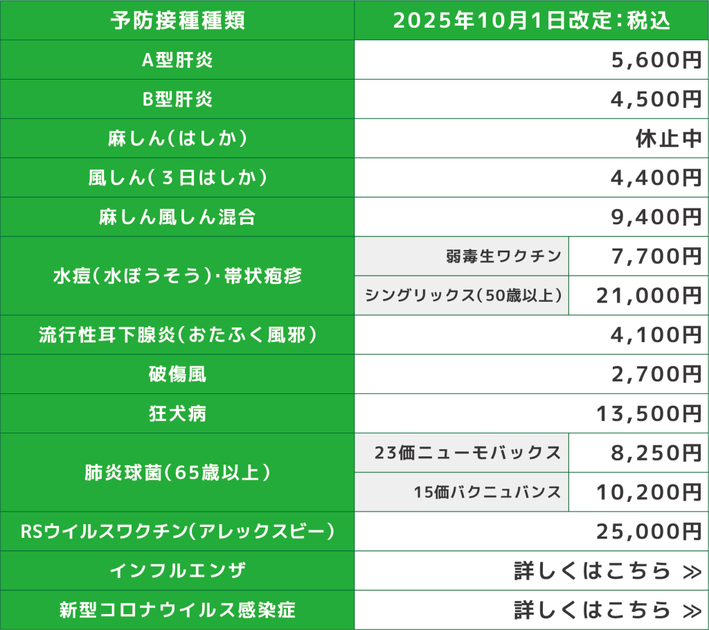 ■ 予約制です。■ ワクチン接種1回あたりの金額です。 複数回の接種が必要になるワクチンもあります。■ 料金は変動する場合があります。■ 接種前に抗体採血が必要な予防接種もあります。 別途料金がかかります。■ 詳しくは当院のスタッフまでお問い合わせください。TEL:0197-61-2022(直通)