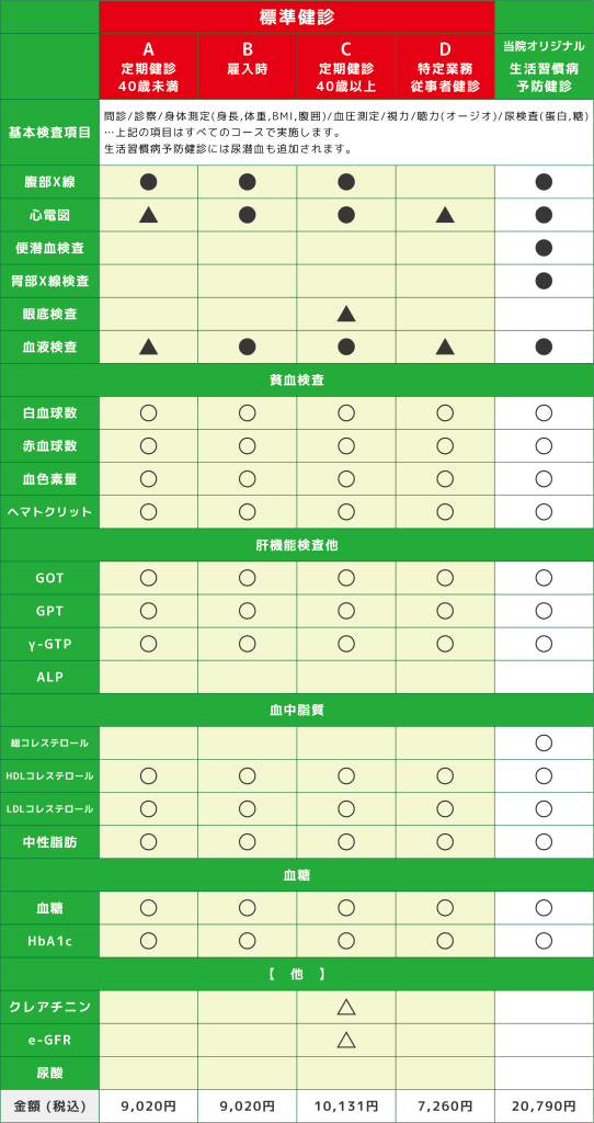 ※ 胸部レントゲン(X写真)がある場合:妊娠又はその可能性がある方は実施できませんので、お申し出ください。※ △▲の項目は、医師の指示により省略・追加される検査項目です。※ 上記コースにオプションとしてご希望の検査項目を追加することもできます。詳細はお問い合わせください。TEL:0197-61-2022(直通)