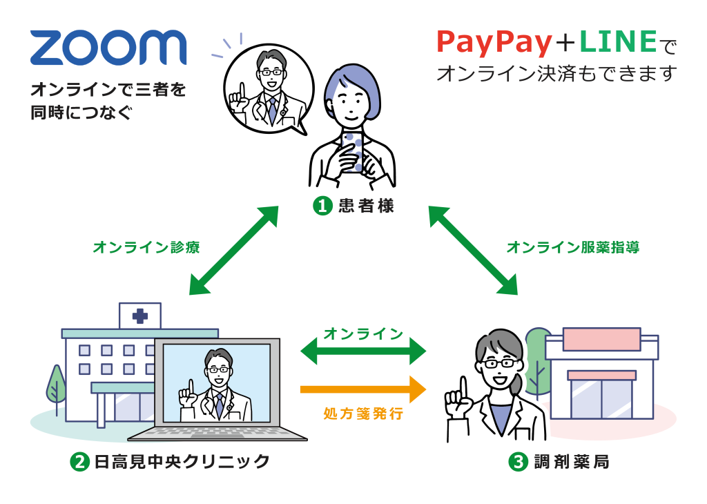 スマートフォンなどを使用して診療、服薬指導、会計までオンラインで出来ます