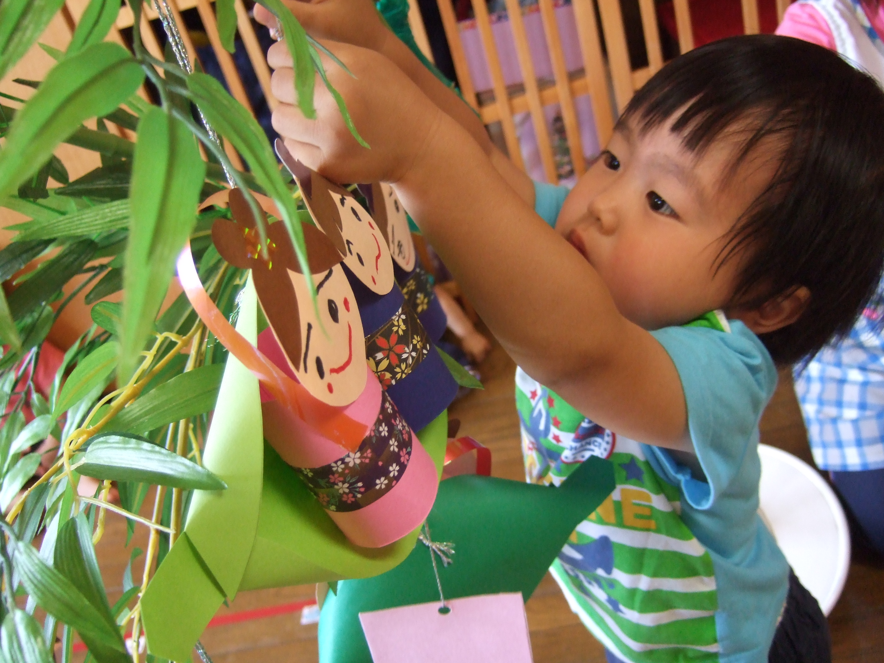 ヒマワリ組さんの七夕飾り、笹船に乗った織姫と彦星上手に出来ました。