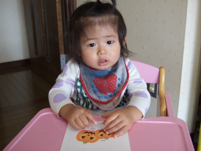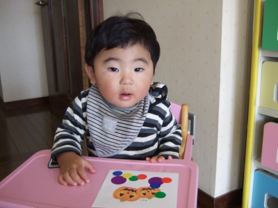 制作活動。ハロウィンのお菓子袋にシールを貼りましたー。